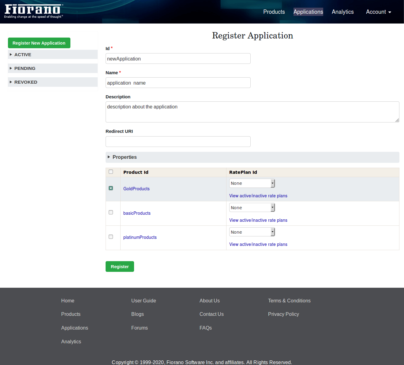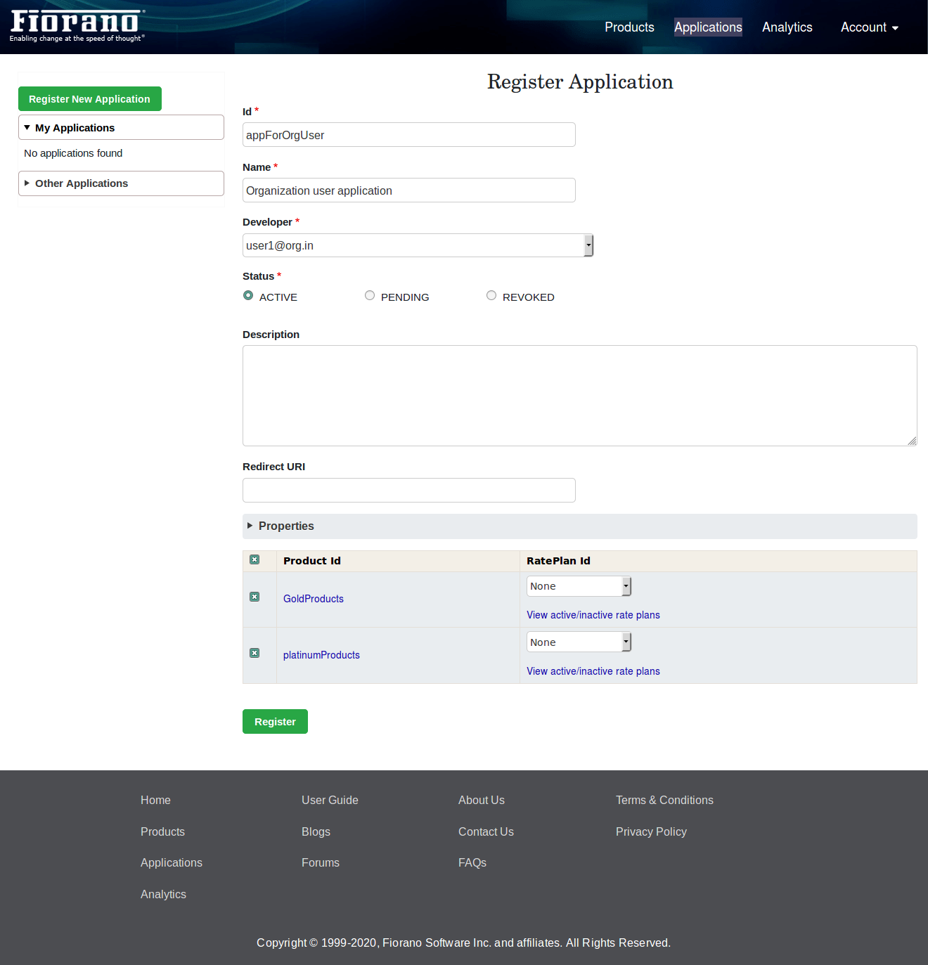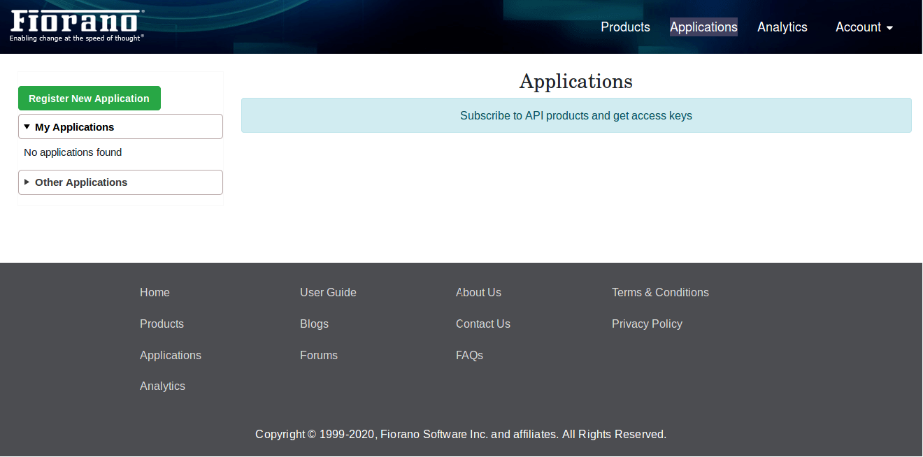 Click the Register New Application button under the server group in which the application needs to be created. By default, the Products table will be empty.