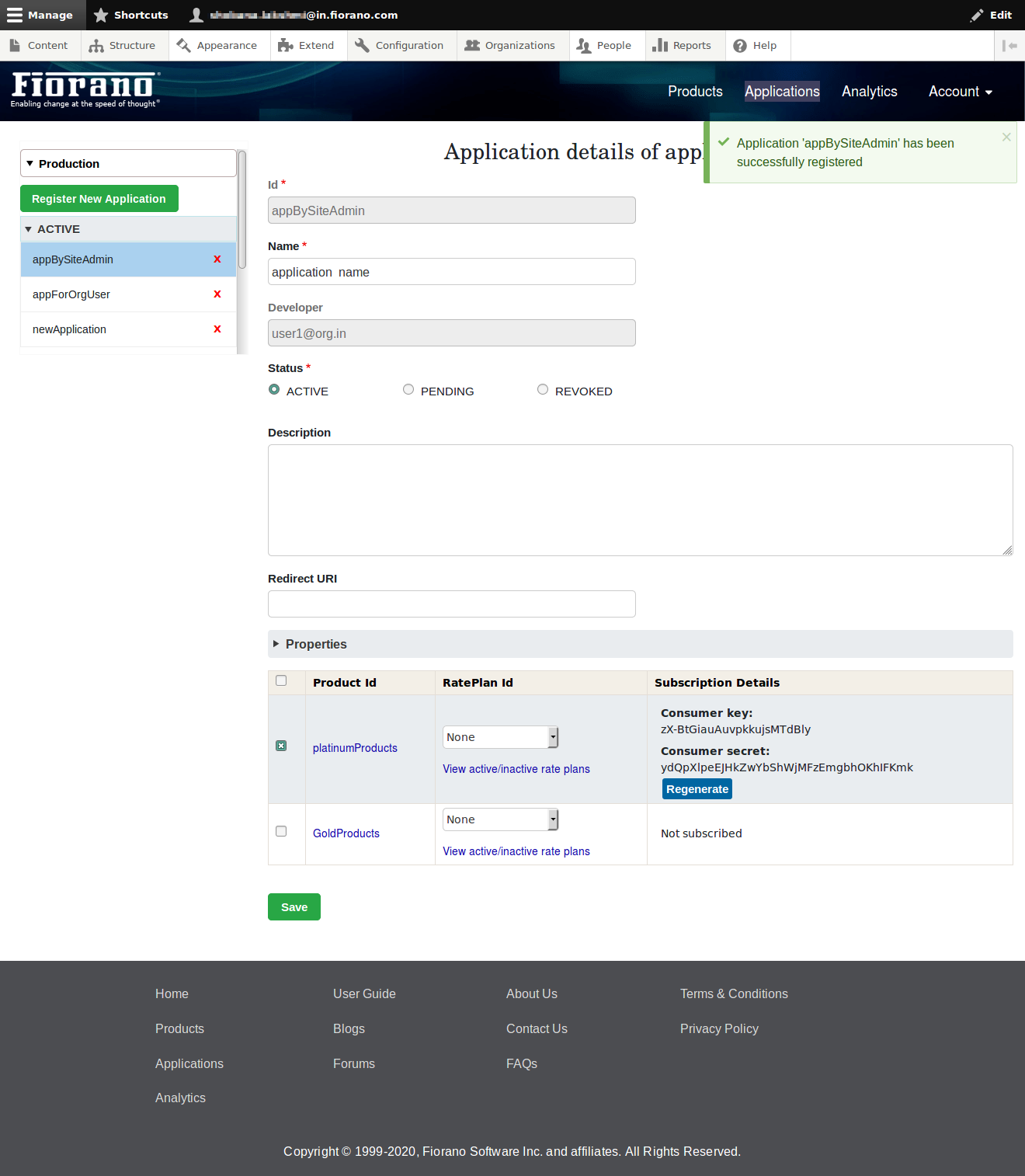 When an application is saved, the Product table will have Subscription Details column where consumer key and consumer secret for the subscribed product can be seen.