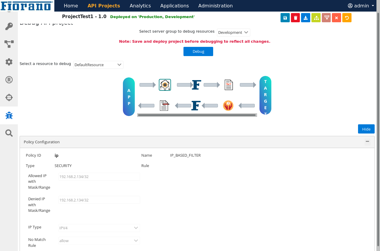 Click the Debug icon on the left side of the API Projects screen to debug resources.