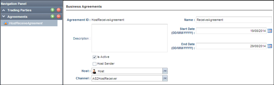 Business Agreements define the contract between the host and the remote trading party to send or receive documents using a specific channel (protocol). They can be used to monitor and manage the interactions with partners and also define a time period for the interaction after which the agreement will become inactive.