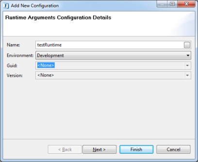 To define a MessageFilters Configuration, right click on MessageFilters in the Configuration Repository view and select the Add Configuration option. Enter the configuration name, select the environment and click the Next button. Enter values for MessageFilters Configuration and click Finish to save as the Named Configuration, as shown in the figure below.