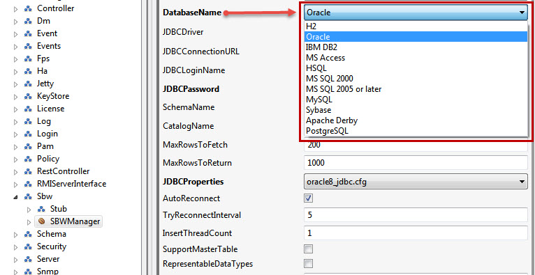 Load the profile and navigate to FES > Fiorano > Esb > Sbw > SBWManager. The Properties of SBWManager dialog box on the right displays all the database properties along with their default values.