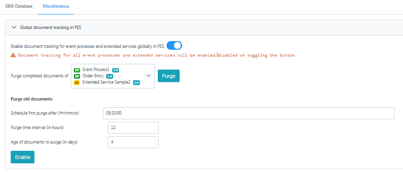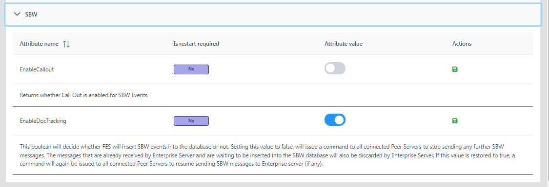 EnableDocTracking: This boolean will decide whether FES will insert SBW events into the database or not. Setting this value to false, will issue a command to all connected Peer Servers to stop sending any further SBW messages. The messages that are already received by Enterprise Server and are waiting to be inserted into the SBW database will also be discarded by Enterprise Server. If this value is restored to true, a command will again be issued to all connected Peer Servers to resume sending SBW messages to Enterprise server (if any).