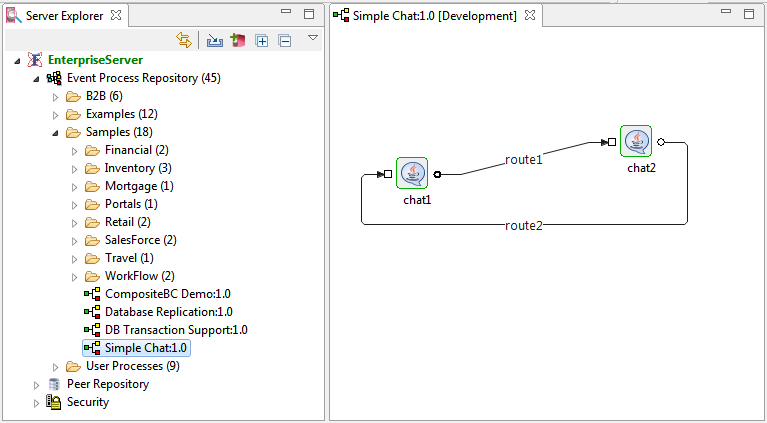 An Event Process: 'SimpleChat' is provided in eStudio application as a sample to understand the functionality of Chat component. To find the Simple Chat EP, Open Server Explorer window from Window > Show View and find under Samples folder in Event Process Repository. Double-click to open the sample.