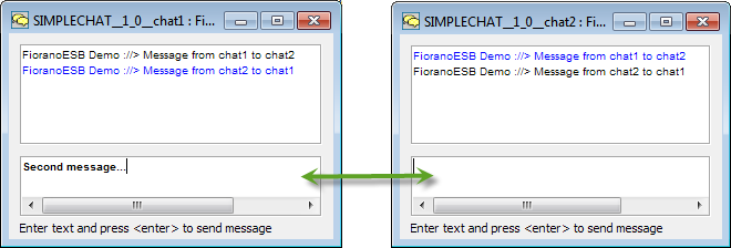 Type a sample message in SIMPLECHAT__1_0_chat1 and press Enter; notice that the message appears in SIMPLECHAT_1_0_chat2 window.