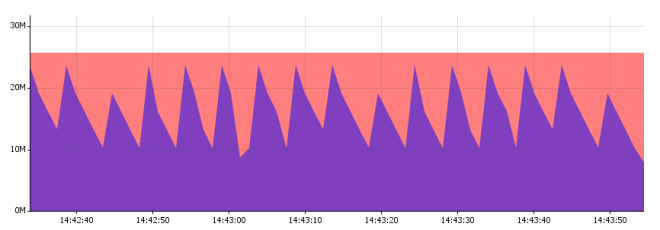 A well-tuned component, as illustrated in figure 6, neither performs garbage collection very frequently nor does it take an unacceptable amount of time performing garbage collection. The heap memory size does not shoot up or come down drastically at any point. It is generally quite stable increasing from the minimum heap size to the maximum heap size and then back to the minimum heap size, which should be the amount of memory needed by the component.
