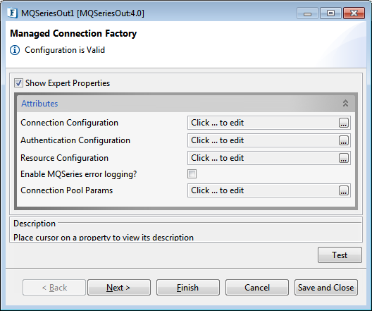 The Connection details are configured in the first panel, Managed Connection Factory (MCF). The Figure 12 illustrates the panel with expert properties view enabled.