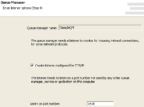 The port number on which IBM WebSphere MQ listens for connection requests to connect to configured Queue Manager. To view the port number for required Queue Manager (value for property Queue Manager Name, expand the node IBM WebSphere MQ > Queue Managers > SampleQM > Advanced > Listeners as shown in Figure 13. The value in Port column is the required port number.