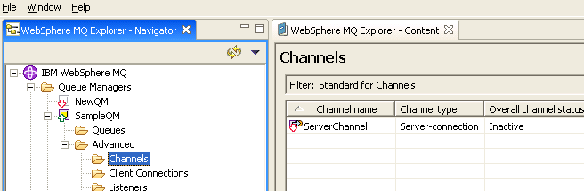 12. On successful completion, newly added server-connection channel is shown when IBM WebSphere MQ > Queue Managers > SampleQM > Advanced > Channels node is expanded as shown in Figure 7.