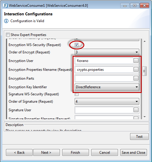 - To verify the credentials, Encryption action must be enabled in WSConsumer too (as configured in WSStub). So, scroll down the screen and provide the following values under Security – Request section: