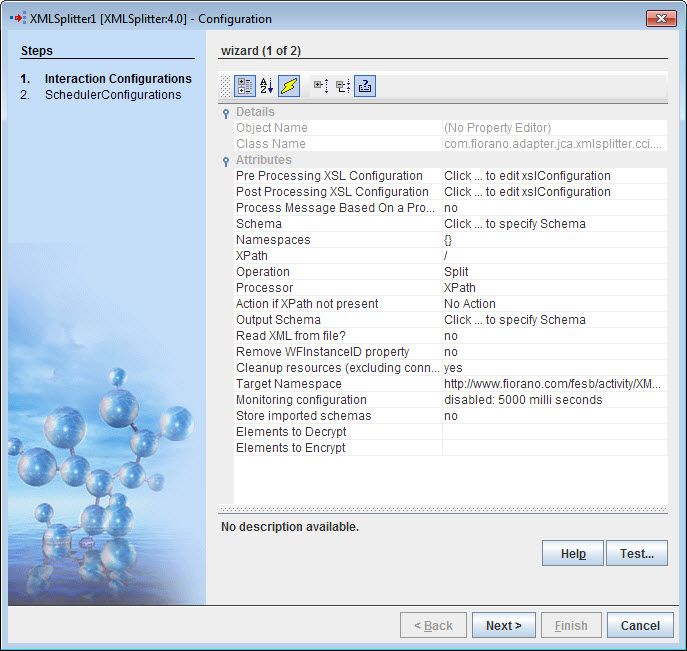 Configure XMLSplitter as described in Configuration and Testing section. The configuration for this example is shown below. In the example given below, the Xpath element selected is /ns1:BookStore/ns1:Book/ns1:Title and Group is selected as /ns1:BookStore/ns1:Book.
