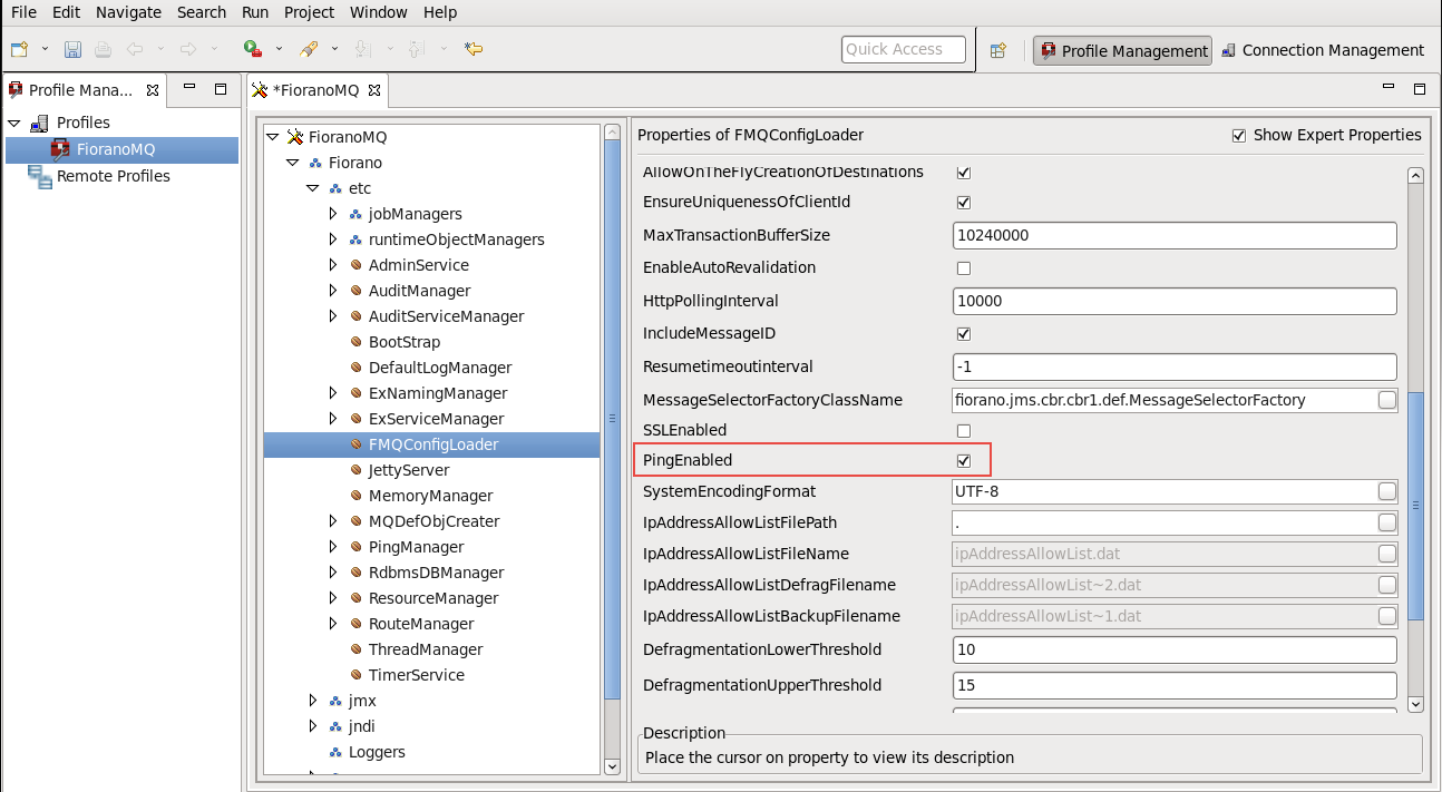 From FioranoMQ 9.1.0 release onwards, the PingEnabled parameter is set to 'true' as its default value. This property can be controlled if client connections are automatically pinged. Pinging is essential for detecting Network problems. Enabling 'pinging' will make sure that connections that are no longer valid are properly closed and the resources they use are cleaned up in the FioranoMQ Server.