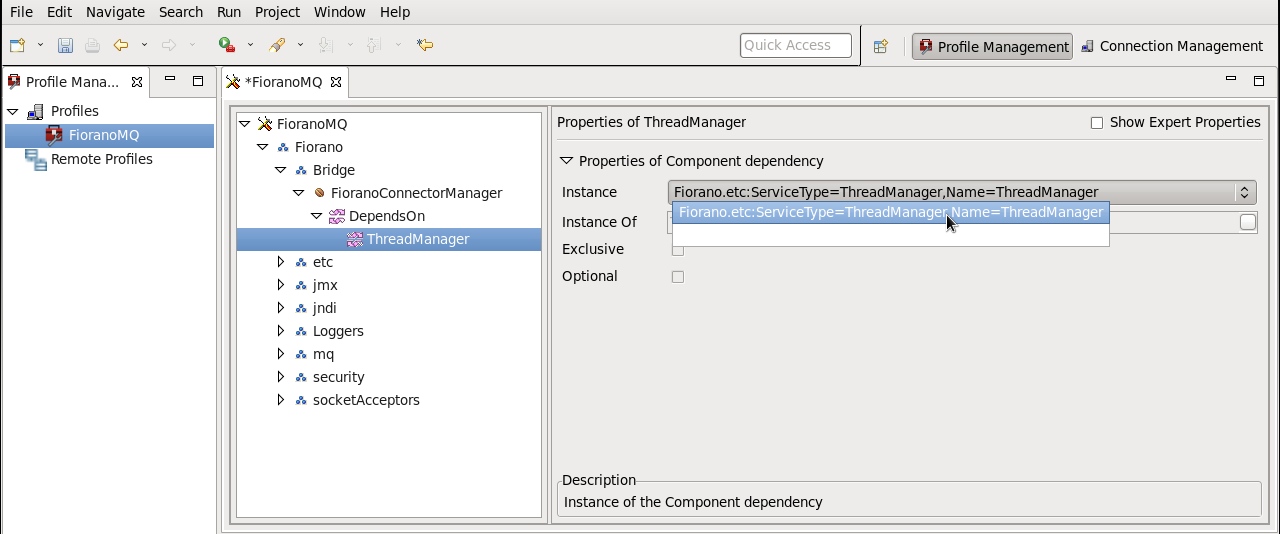 - Navigate to *FioranoConnectorManager?DependsOn?ThreadManager. By clicking on the *ThreadManager, the user can see properties on the right-hand side of studio. By default, instance property will be null. Select the only instance present there. Name the FioranoConnectorManager in properties.