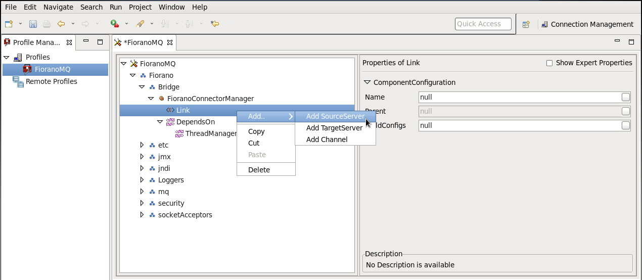 - Right-click Link and add source Server, target Server and channel. Add connectionInfo to the source Server and to the target Server. Add source queue and target queue to the channel. Add queueInfo to source queue and target queue. All components added need to be configured. Configuration techniques are available in Chapter: 12 Bridge.